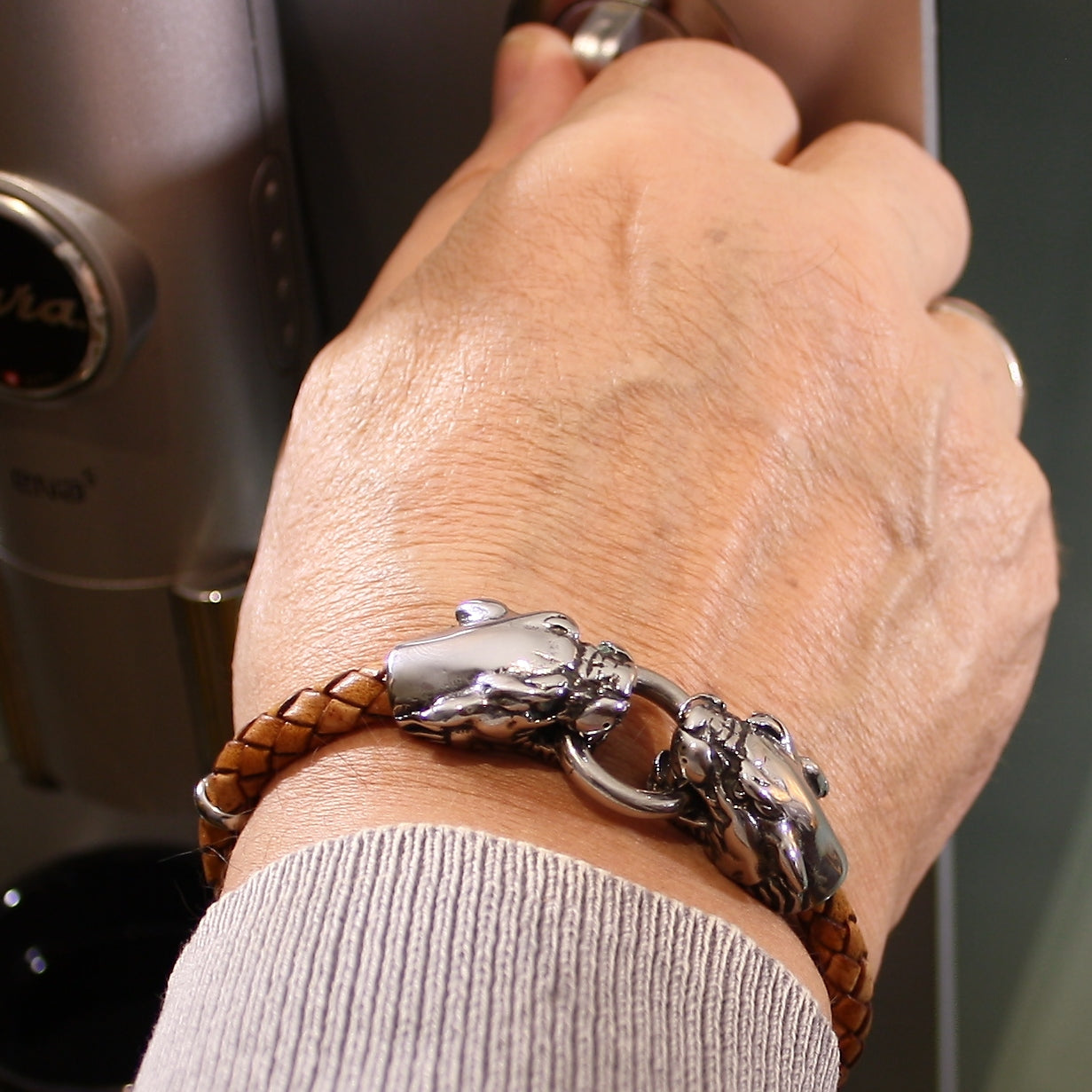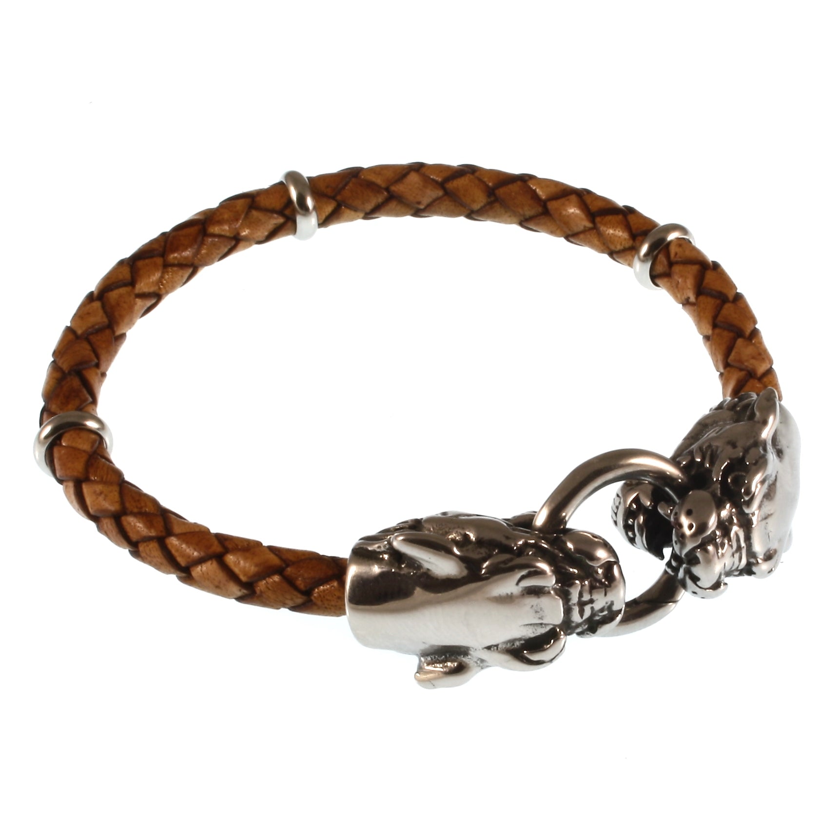 Zwei detailreich ausgearbeitete Löwenköpfe halten den Edelstahlring und damit das WAVEPIRATE Armband LION / LÖWE zusammen.