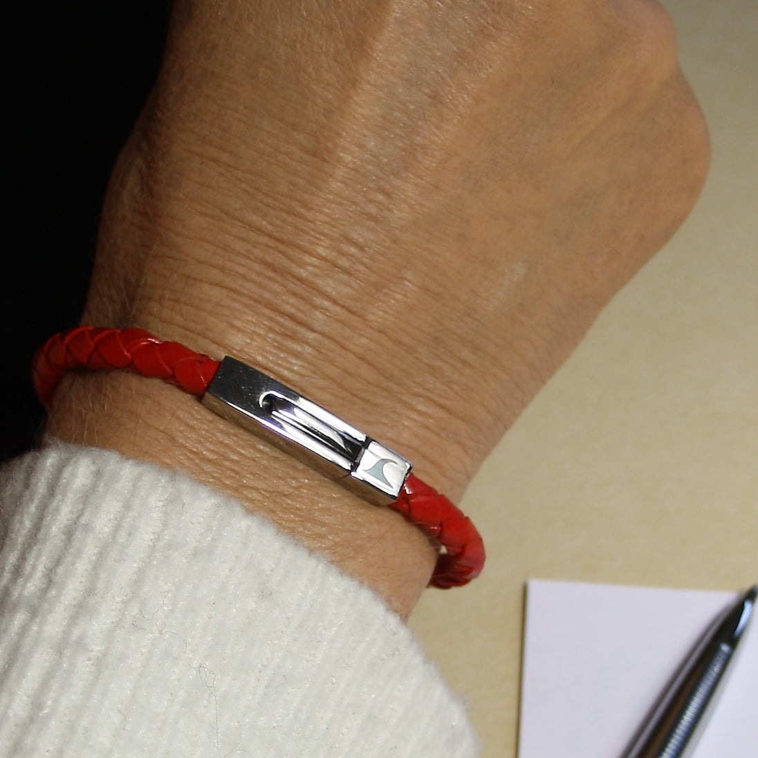 Der 5 mm dünne Riemen mit dem ausgefallenen Edelstahl-Druckverschluss ist lässig und dezent zugleich.