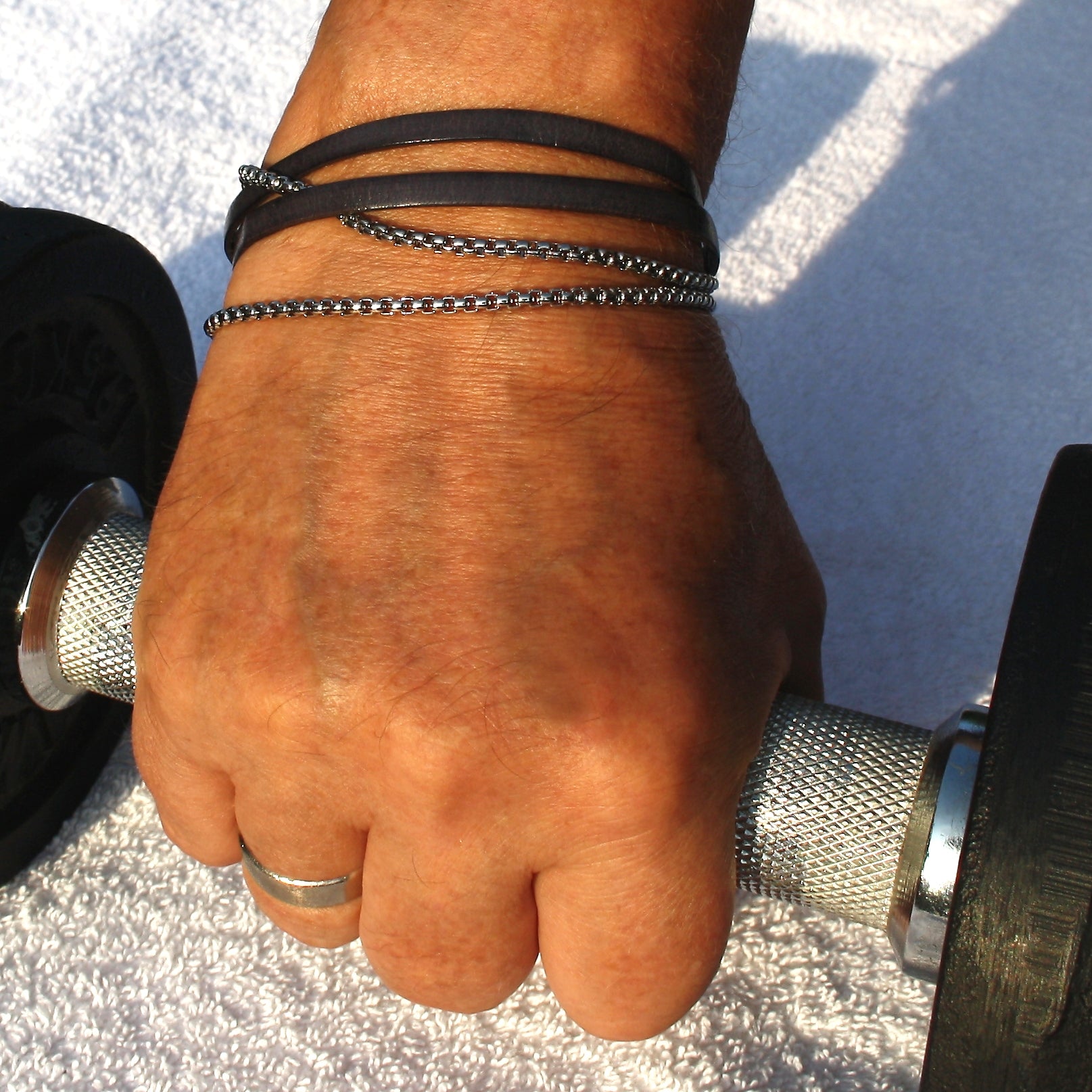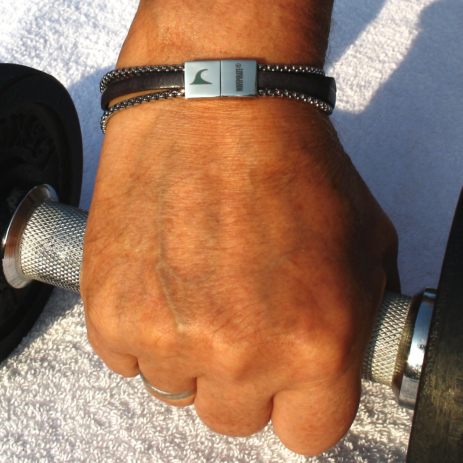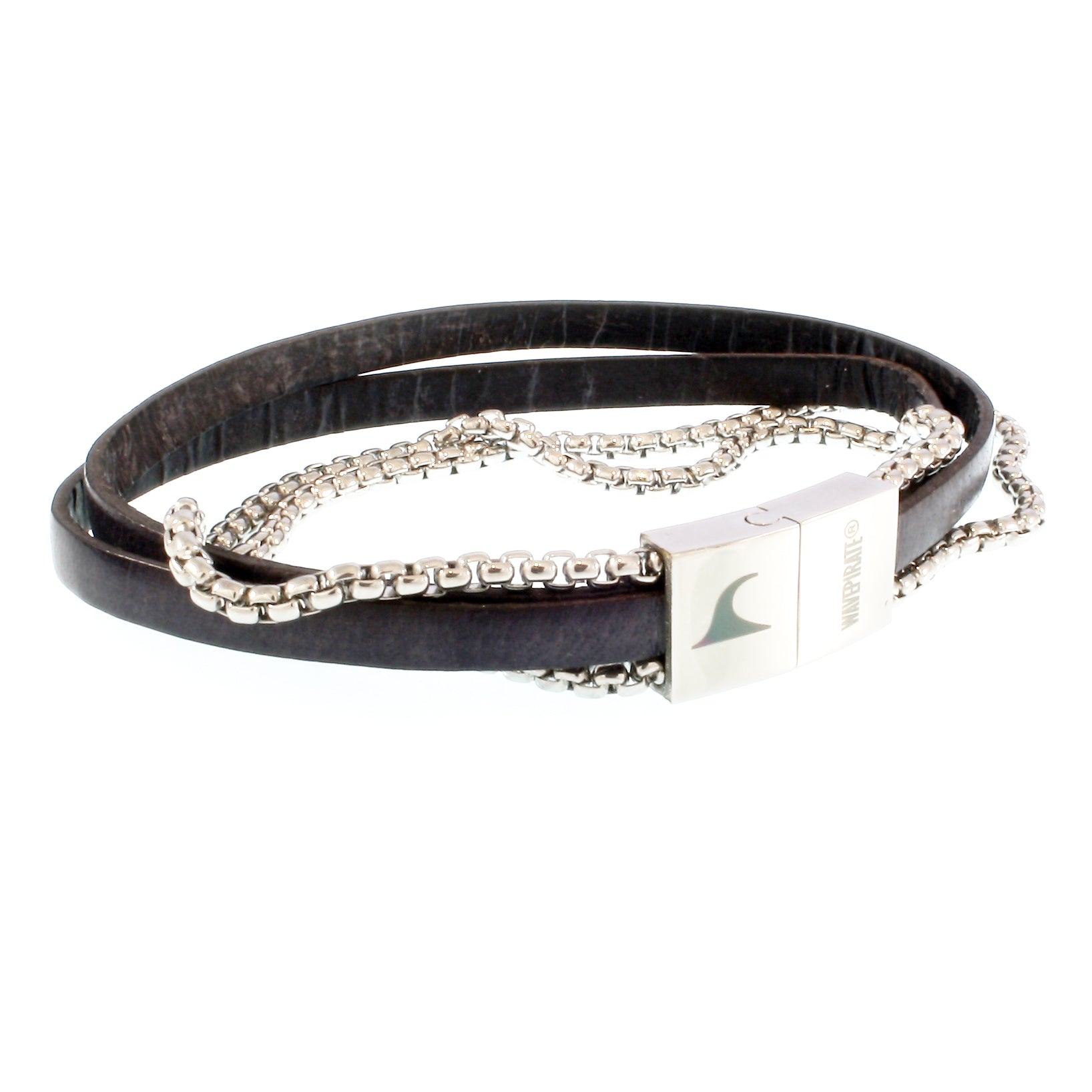 Das WAVEPIRATE Armband REX besteht aus zwei Riemen von feinstem italienischem Premiumleder die sich überkreuzen und von zwei Edelstahlketten eingerahmt werden.