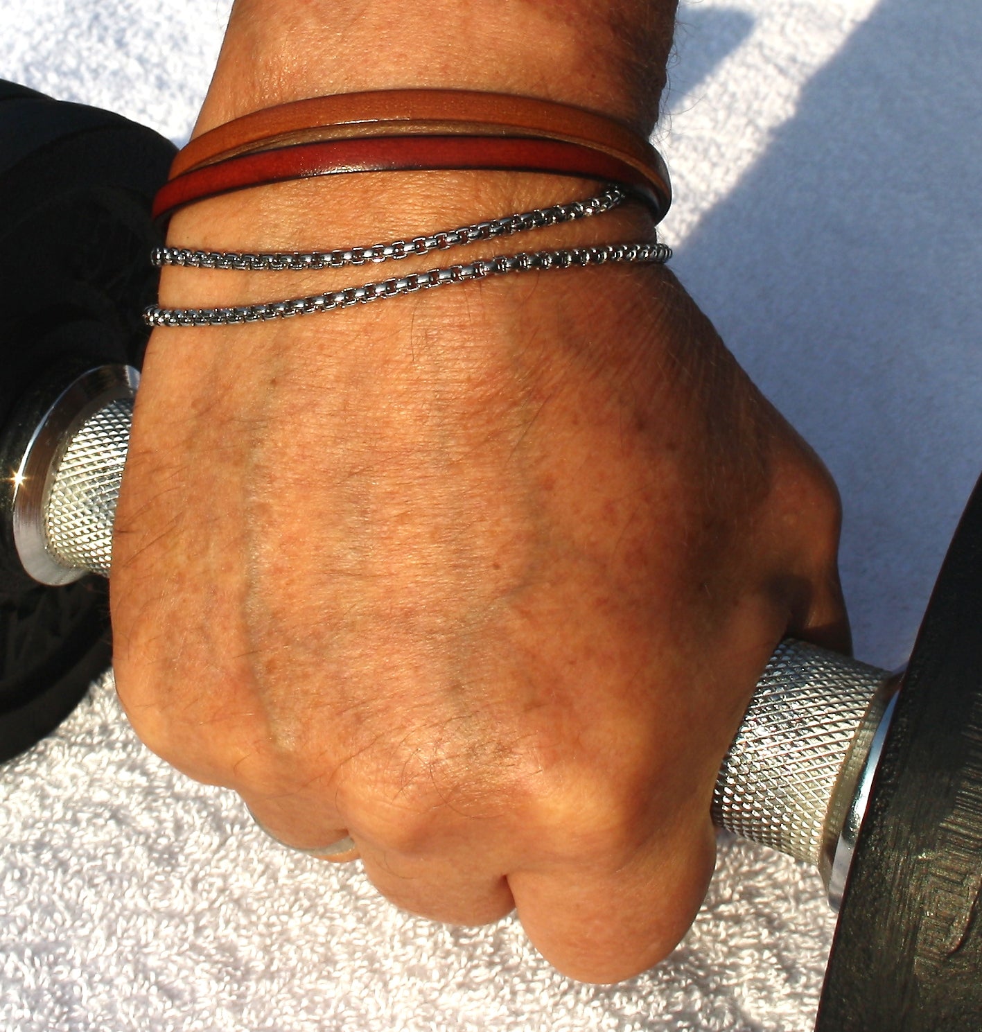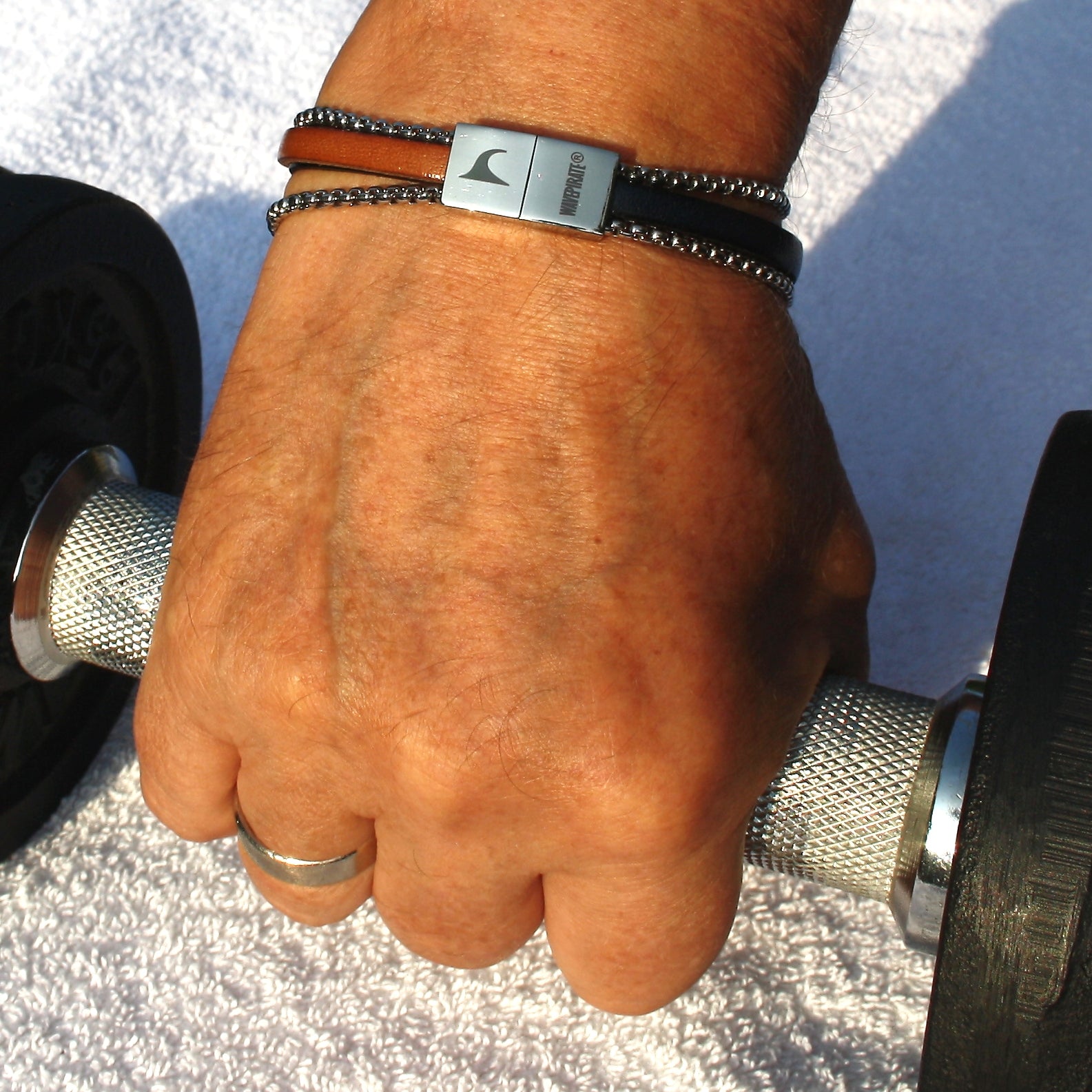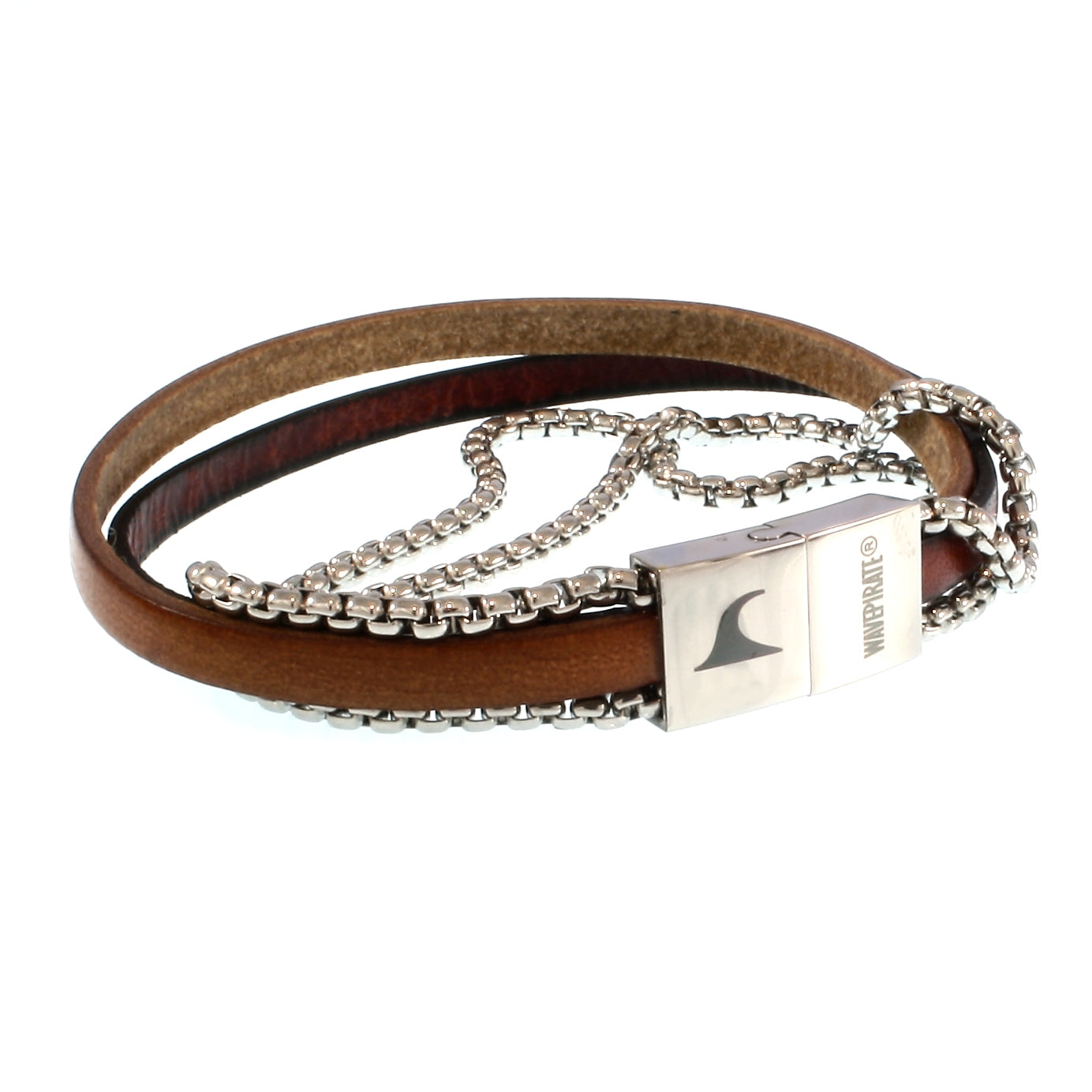 Das WAVEPIRATE Armband REX besteht aus zwei Riemen von feinstem italienischem Premiumleder die sich überkreuzen und von zwei Edelstahlketten eingerahmt werden.