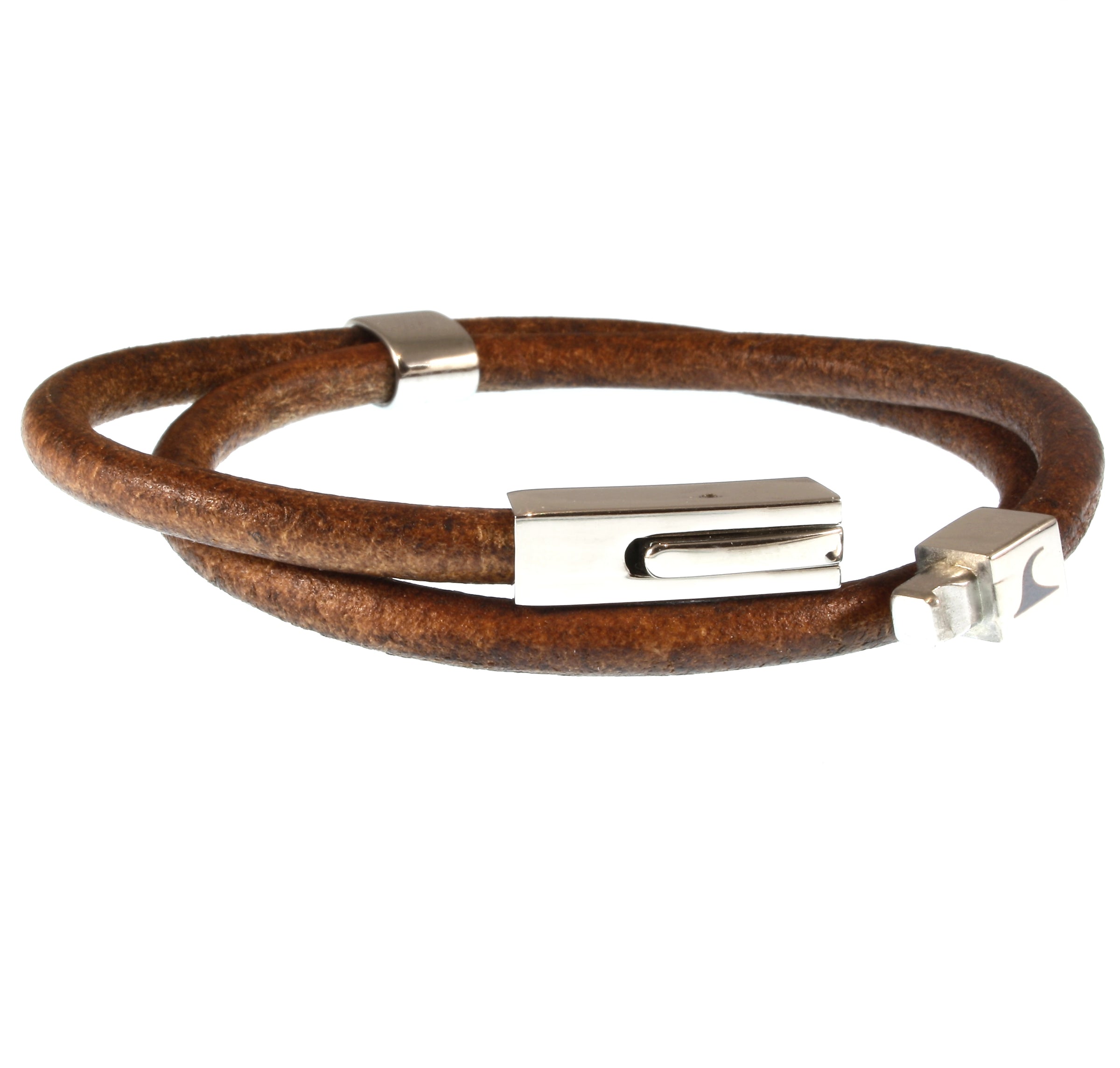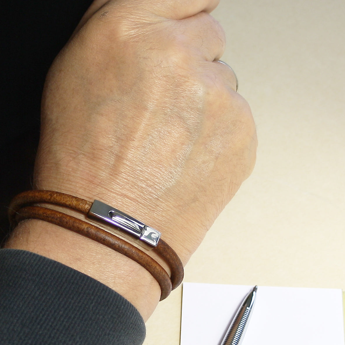 Der 5 mm dünne Riemen mit dem ausgefallenen Edelstahl-Druckverschluss ist lässig und dezent zugleich.