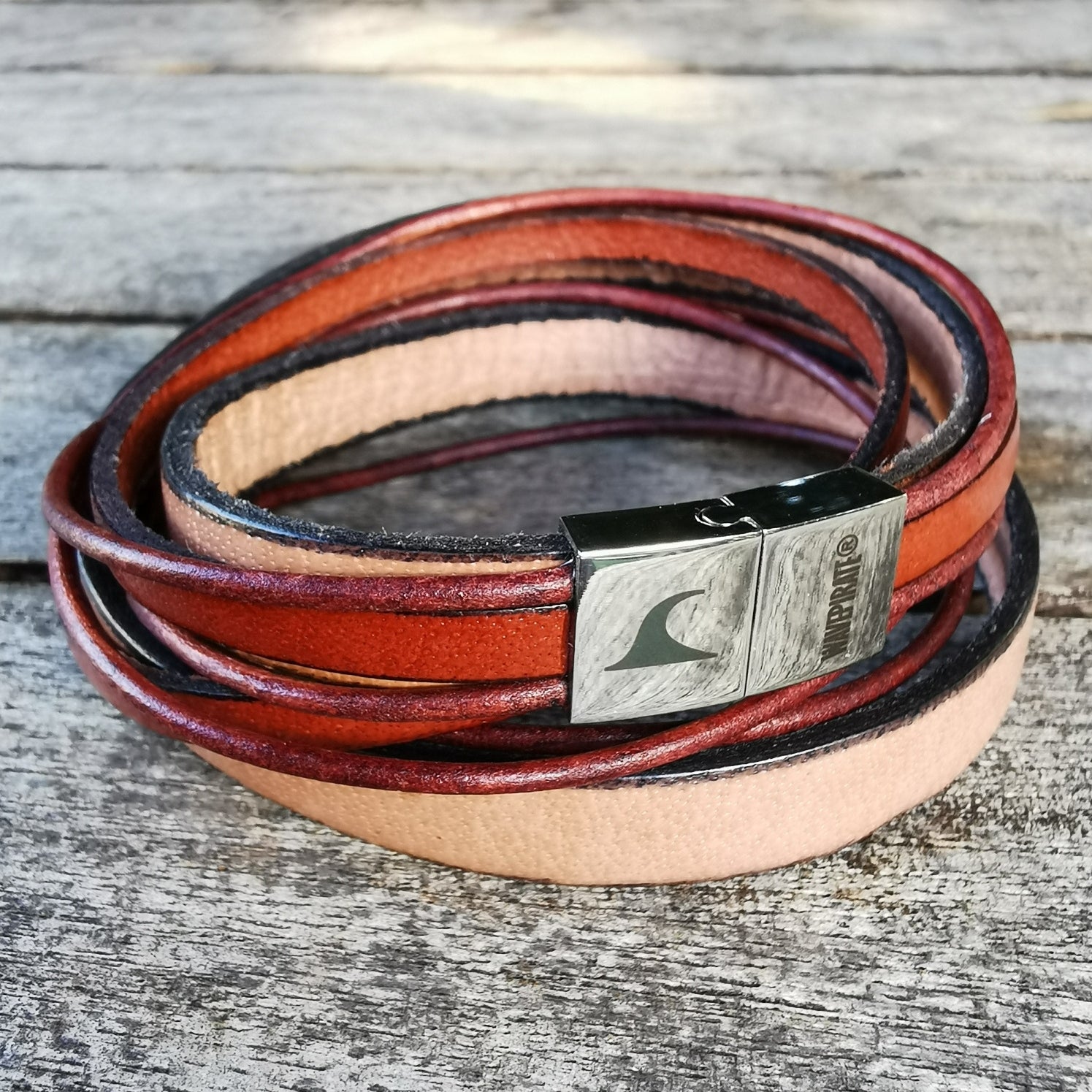 Zwei verschiedene Breiten von feinstem italienischem Premium-Qualitätsleder und zwei Rundriemen in uni oder verschiedenen Farben kombiniert. Doppelt um Dein Handgelenk zu wickeln. Der flache Edelstahl-Magnetschiebeverschluss rundet die klaren Linien ab.