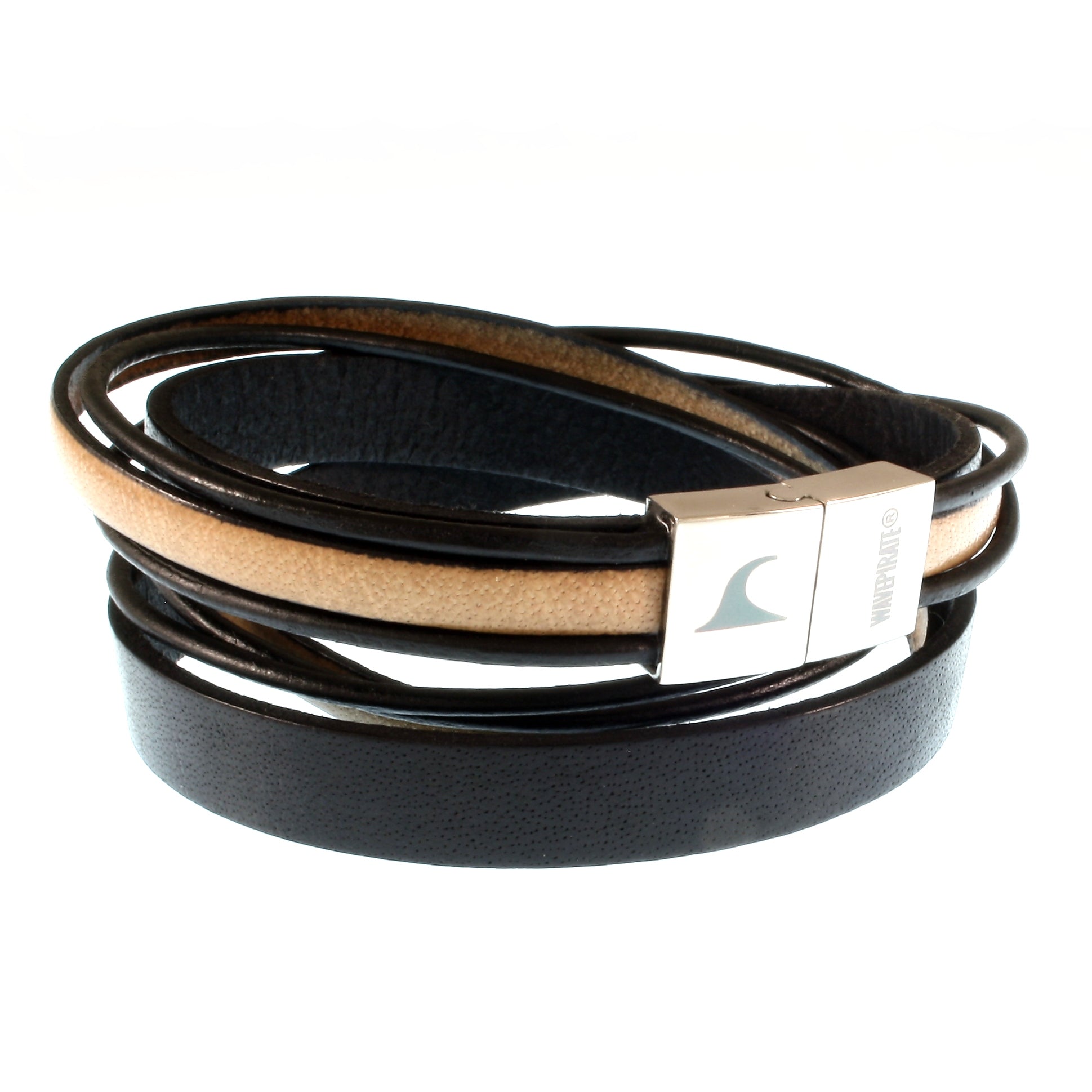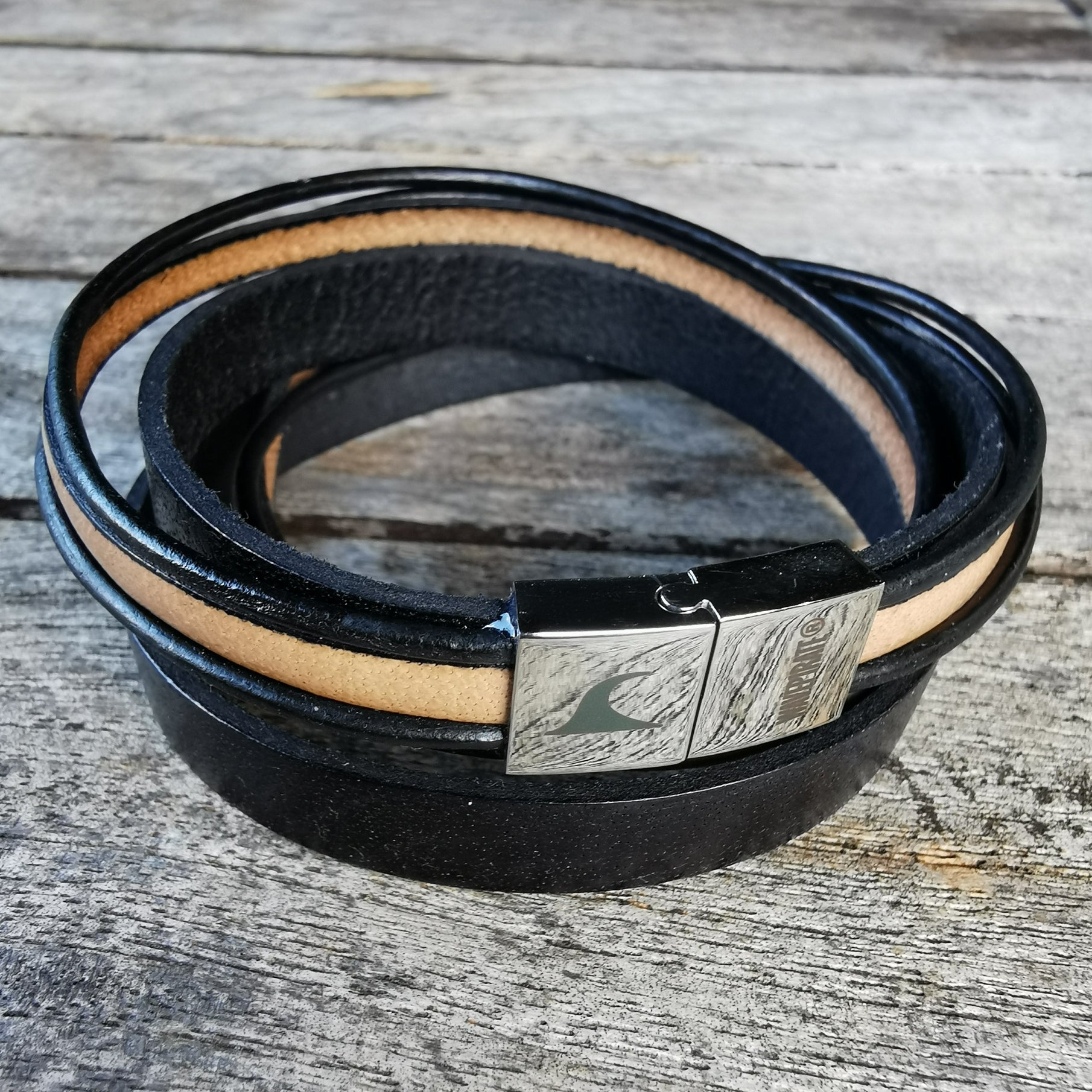 Zwei verschiedene Breiten von feinstem italienischem Premium-Qualitätsleder und zwei Rundriemen in uni oder verschiedenen Farben kombiniert. Doppelt um Dein Handgelenk zu wickeln. Der flache Edelstahl-Magnetschiebeverschluss rundet die klaren Linien ab.