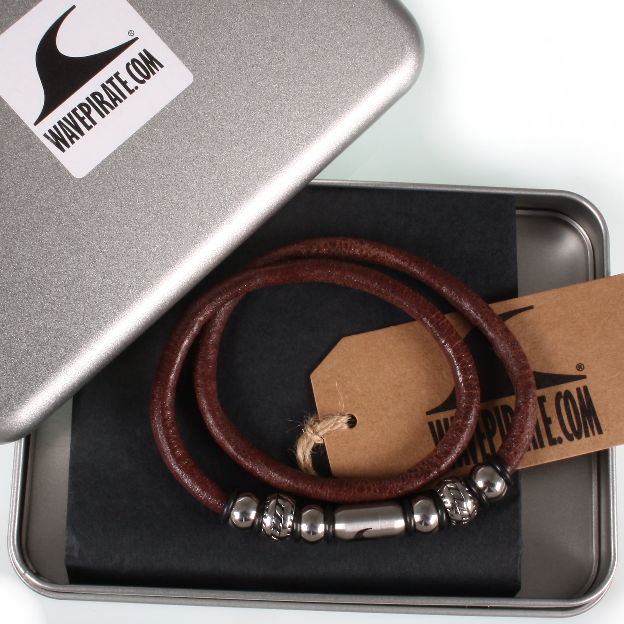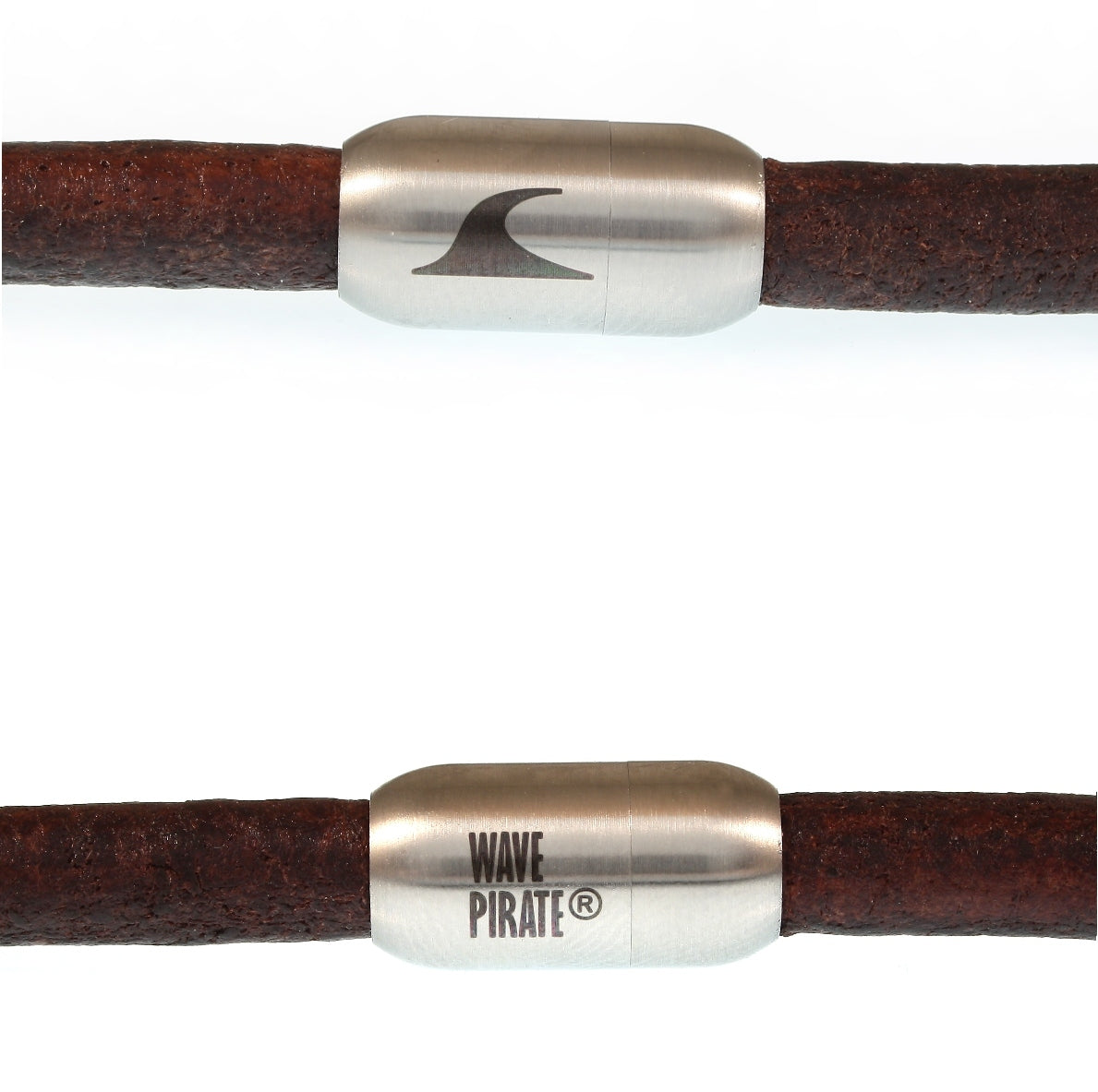 Die WAVEPIRATE Lederhalskette STEEL ist handgefertigt und besetzt mit massiven Edelstahlcharms & Gummi-Abstandsringen.