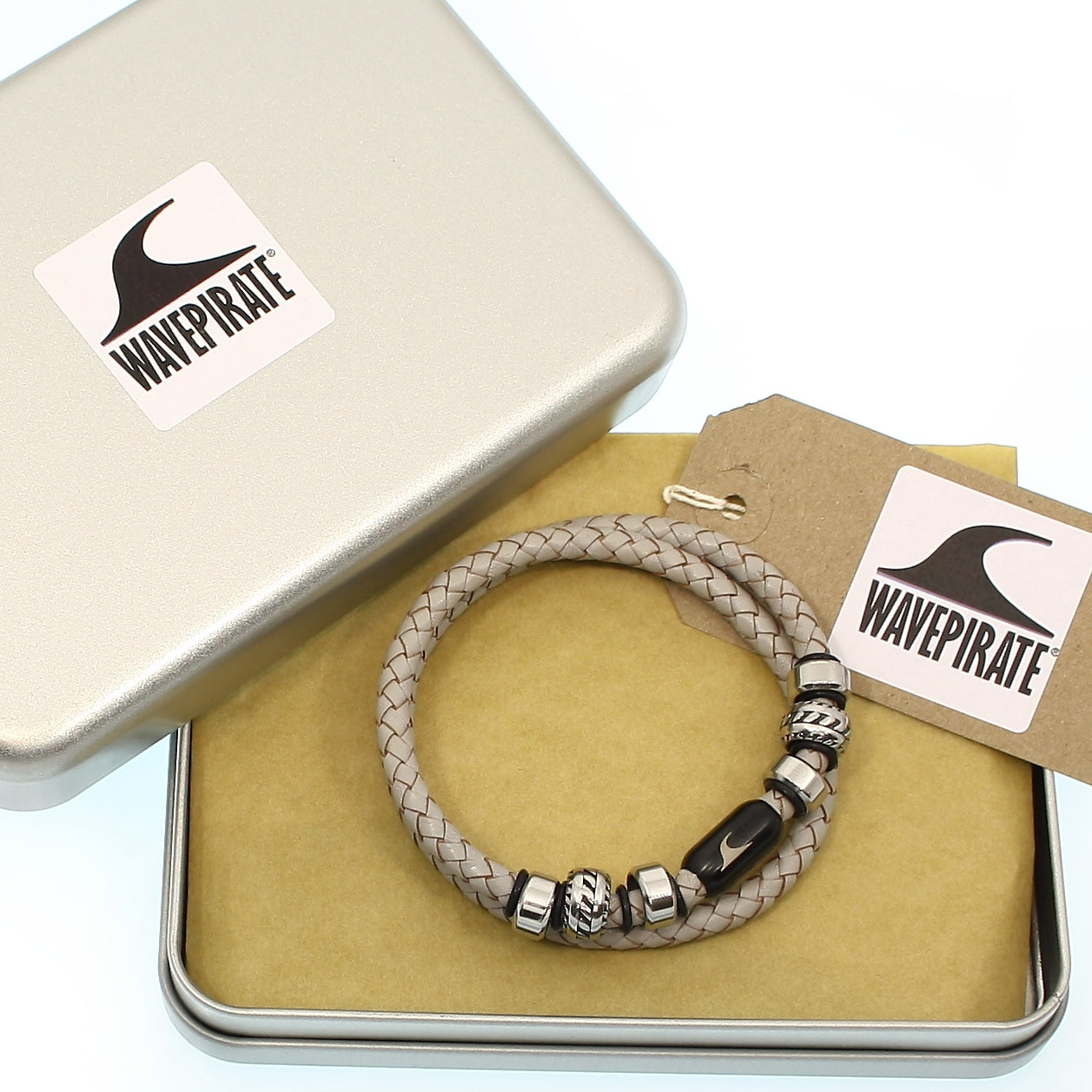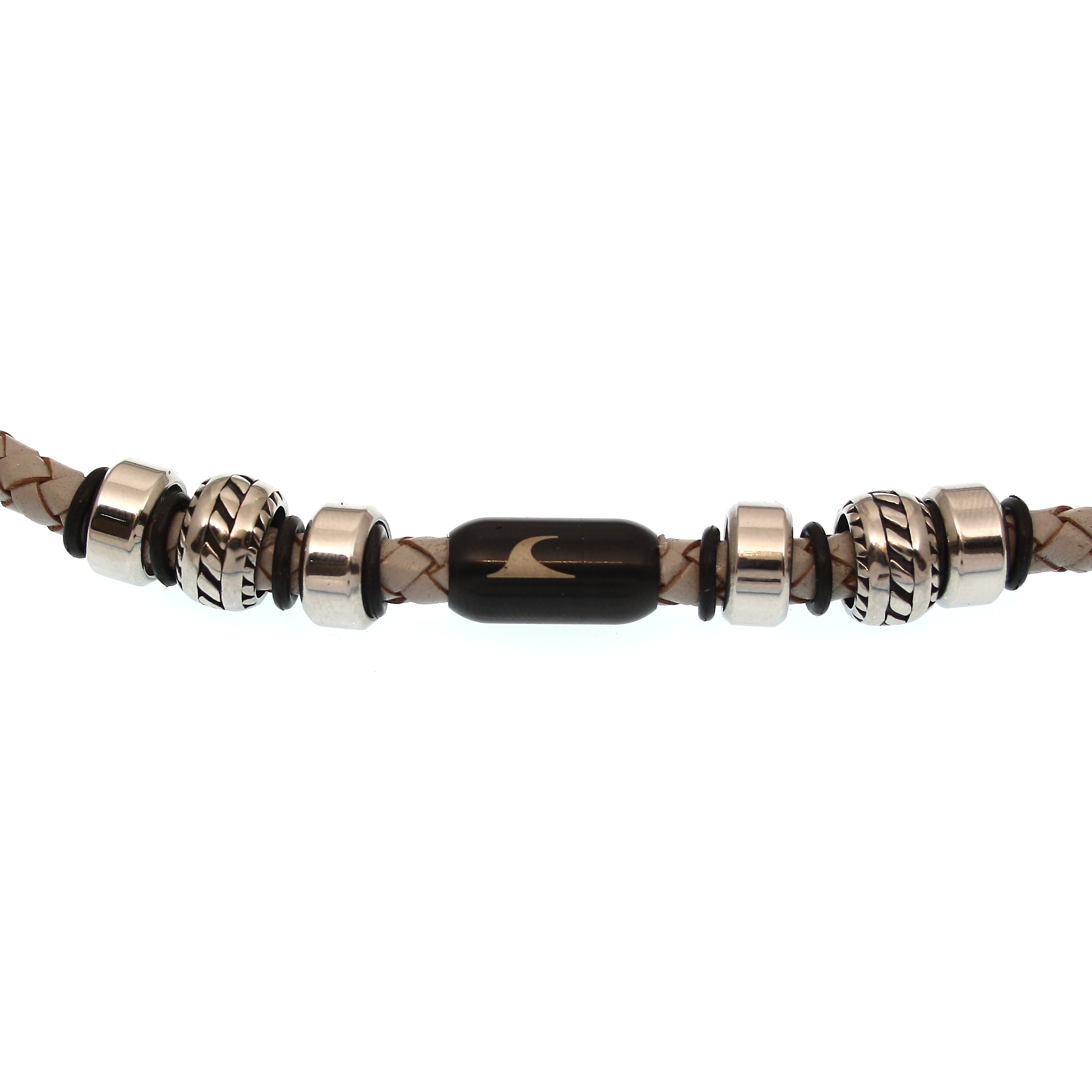Die WAVEPIRATE Lederhalskette STEEL ist handgefertigt und besetzt mit massiven Edelstahlcharms & Gummi-Abstandsringen.