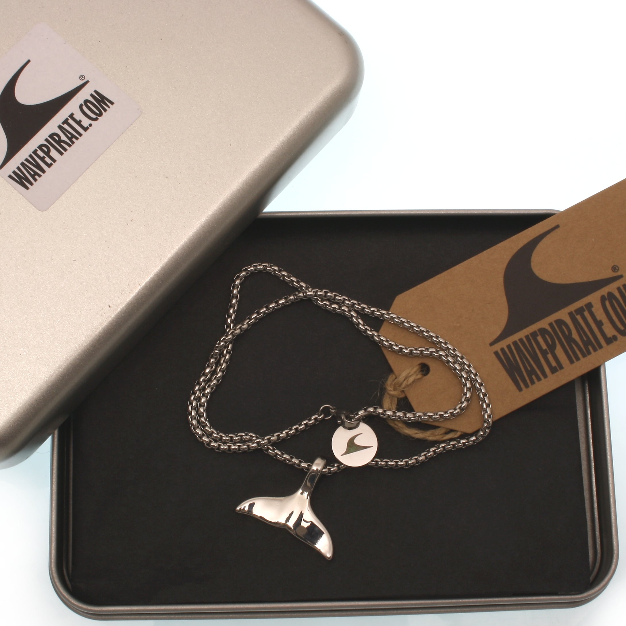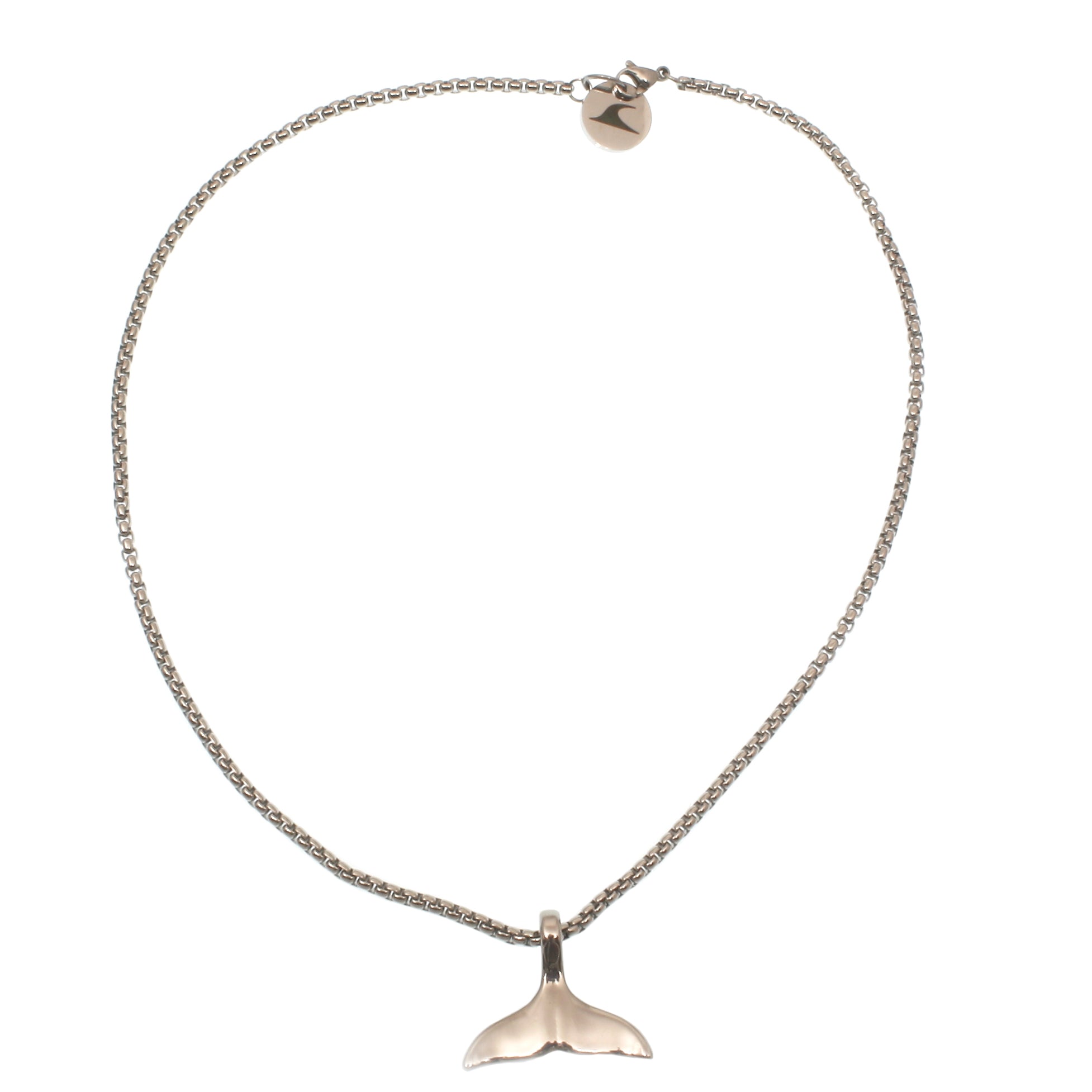 Die Walflosse zwischen den Wellen der Edelstahlhalsketten MOBY ist ein Sinnbild für die Weite und den Frieden der Ozeane.