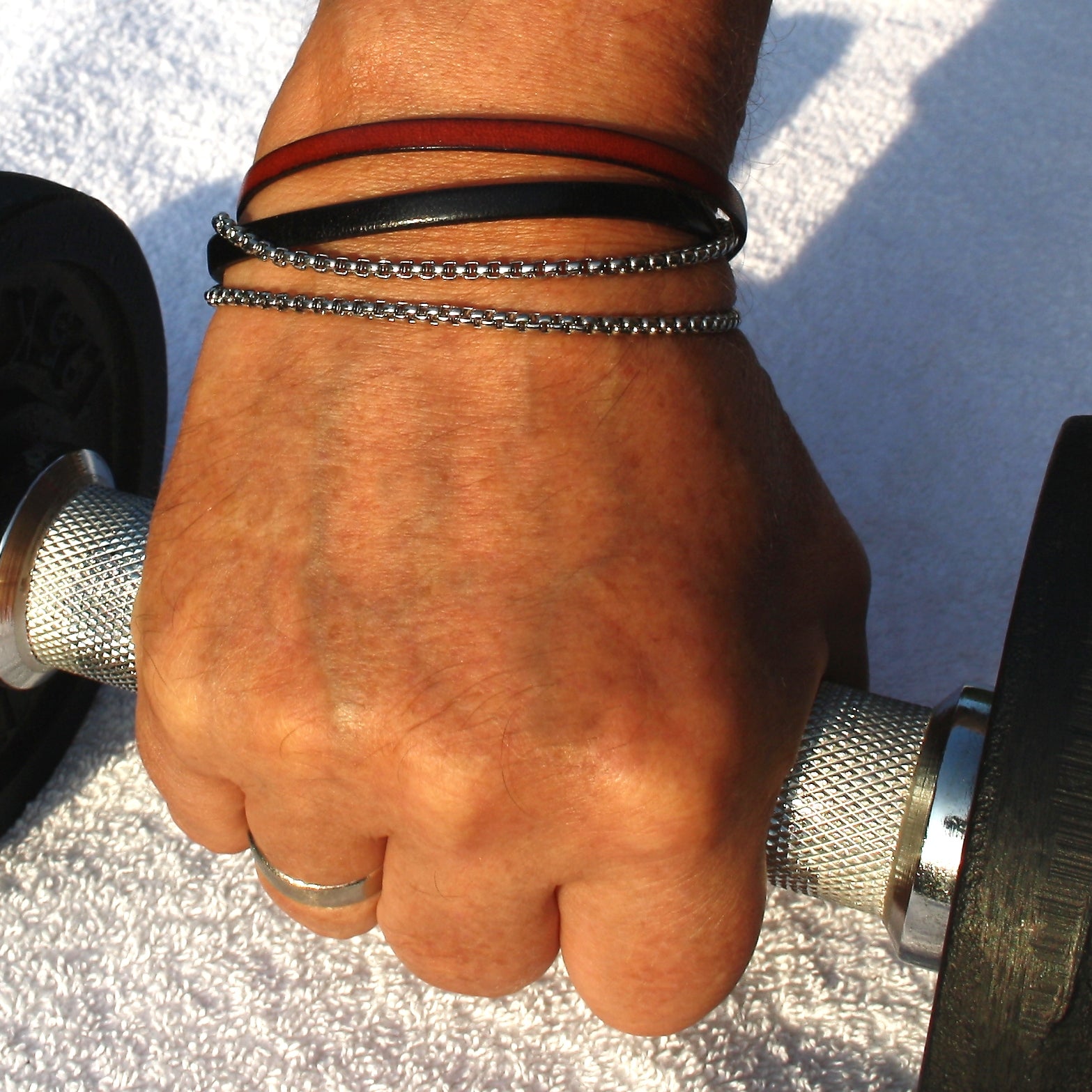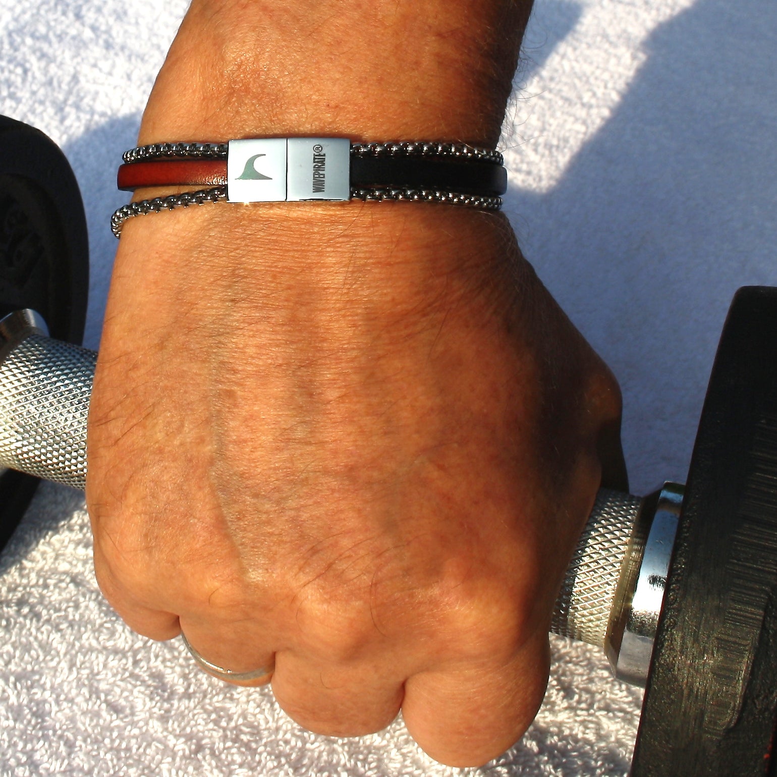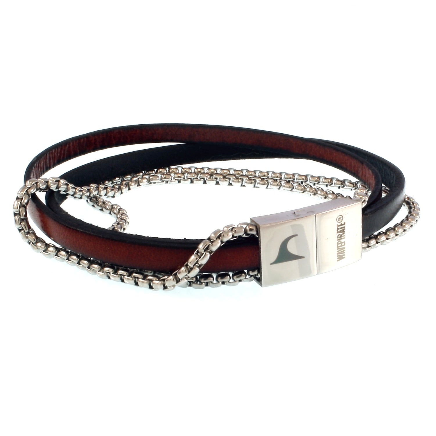 Das WAVEPIRATE Armband REX besteht aus zwei Riemen von feinstem italienischem Premiumleder die sich überkreuzen und von zwei Edelstahlketten eingerahmt werden.