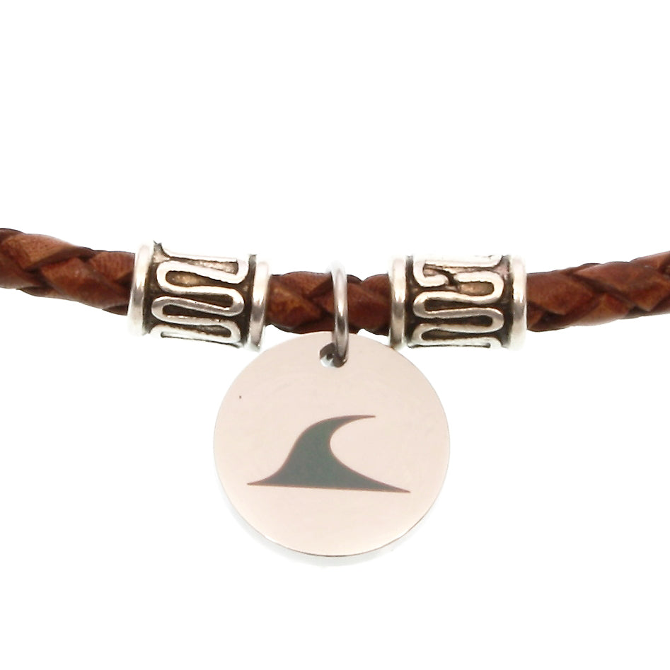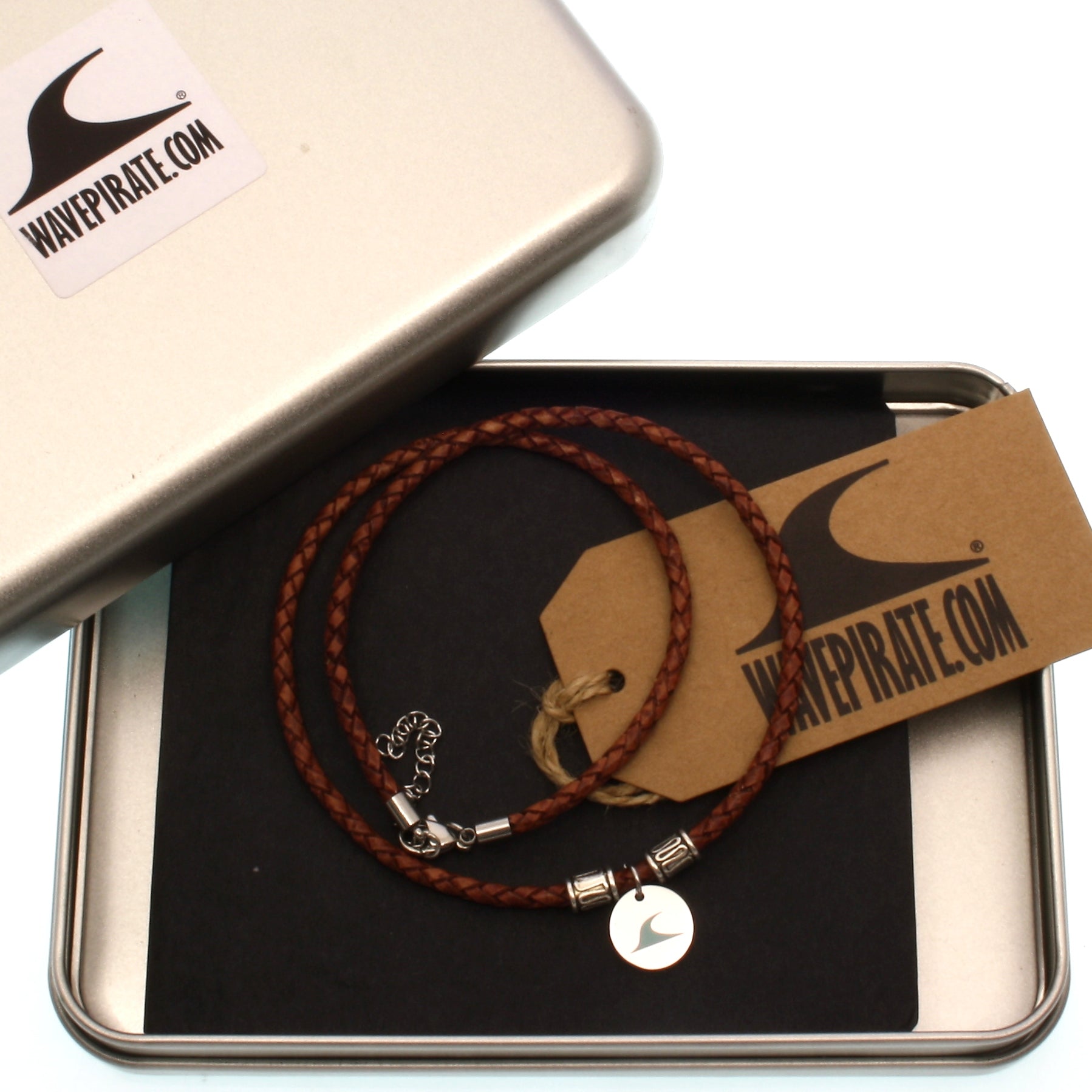 Die WAVEPIRATE Lederhalskette REEF aus massiven oder geflochtenen Lederriemen mit 3 mm Durchmesser, einem Medallion mit unserem Logo und zwei Perlen im tibetanischen Style.